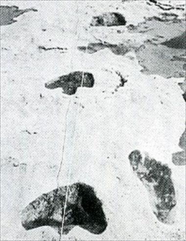 それはなんと、人間の足跡である。大きく円形の、草食恐竜のものとみられる足跡と交差するように、裸足の人間の足跡らしき化石が点々と続いているのだ。発掘調査の結果、この人間のものらしき足跡は計80個。この足跡は1億1000万年前から1億5000万年前、白亜紀前期の地層に存在するもので、研究の結果彫刻した痕跡がないことから本物の足跡化石である事が判明した。