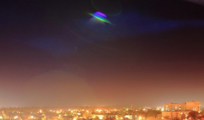 夜の風景を捉えた写真の中に、怪しく虹色に光る物体が浮かんでいる。
