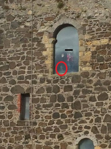 多くの観光客と共に城が写っているが、その城の一部がわかる。窓をよく見てみると、窓に張り付いて外の様子を見ている観光客らしき姿がある。