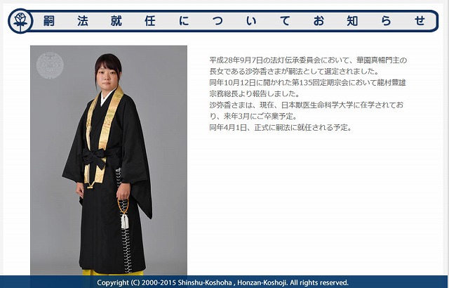 読売新聞の報道によると真宗興正派は門主の後継者である「嗣法(しほう)」に、華園真暢門主の長女で、日本獣医生命科学大4年の沙弥香さん(22)が就くことが10月12日に決まったと報道している。