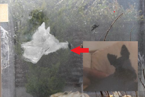 夕食を食べていた際、庭に続く大きなガラス窓に奇妙な汚れが付いていた事に気が付き、近寄ってみたところ亡くなった愛犬とそっくりの形をしていた事に気が付いたのだという。