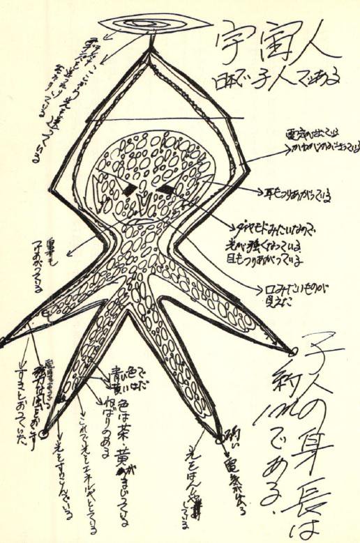さらに青い円錐形と上に楕円形のもののついたヘルメットを被っており、スケッチから見ると昔のSF映画っぱいオーソドックスなタコに似た火星人とグレイ型エイリアンを足して2で割ったような姿である。
