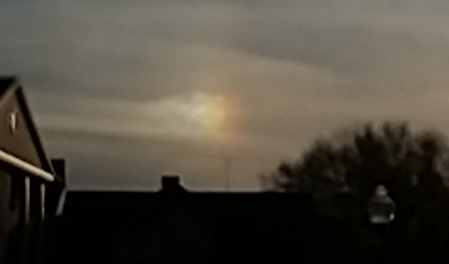 写真には、確かにオレンジ色に染まる空にうっすらと虹色がかった白い物体が捉えられている事が解る。