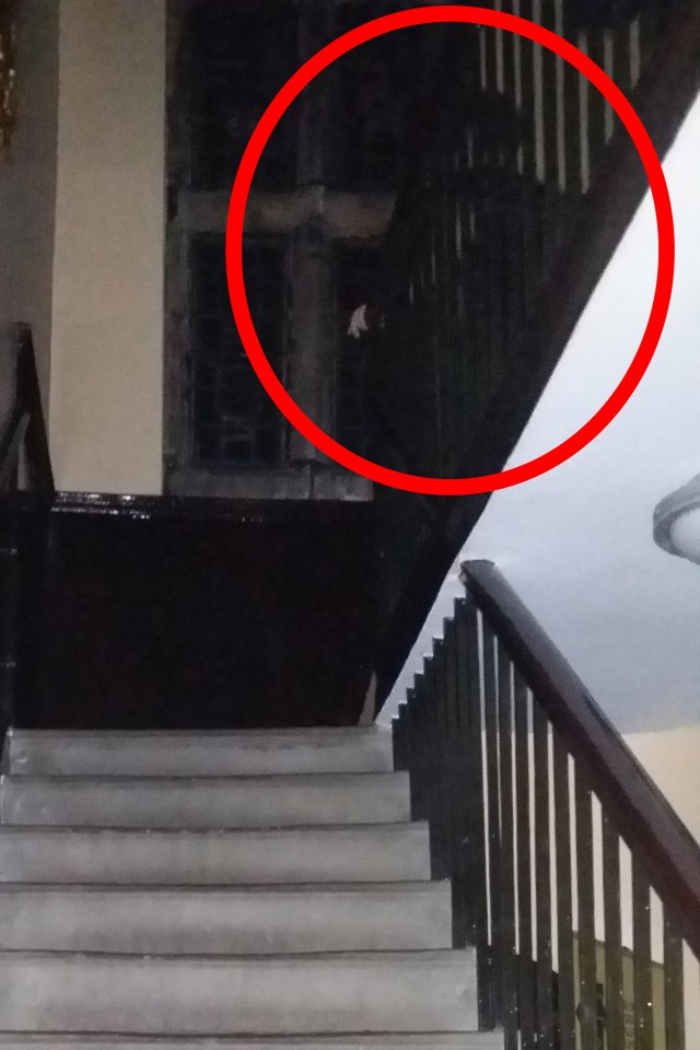 こちらの写真は、イギリス国内で有名な幽霊屋敷である、ウェスト・ヨークシャー州ブラッドフォードのボーリング・ホールという14世紀に建てられた邸宅にて撮影されたものである。薄暗い階段を撮影したものなのだが、踊り場を挟んだ階段の上部に、はっきりと人の姿が写っているのが見て取れる。白い手袋を付けた手がしっかりと手すりを握り込んでいる様子も確認できる。
