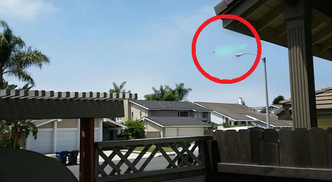 撮影されたのは2013年7月20日午前11時頃、場所はアメリカはカリフォルニア州ハンティントンビーチに住む一般人だった。目撃者は11時頃、飛行機のような轟音が西の空から響いてくる事に気が付いた。しかし、普通の旅客機の立てる音とは違っている気がしたので、外に出て確認してみた所、写真のような円盤が空を横切っていく所だったというのだ。
