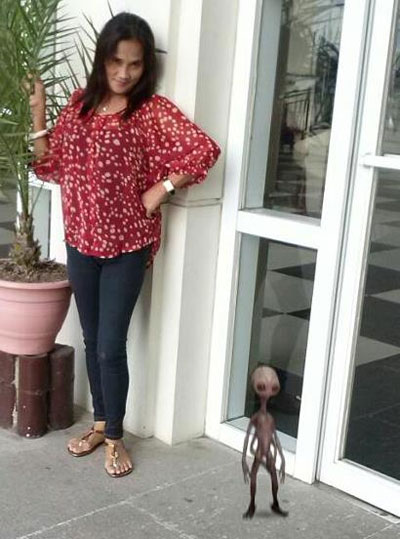 こちらの写真はヴィサヤ・デイリー・スター紙に掲載されたもの。 エミリーさんという女性が撮った写真で、自宅のバルコニーで若い女性がカメラに向かってポーズをとっている。だがその足元を見ると、膝丈ぐらいの大きさしかない小さなエイリアンが写っているのだ。全身は肌色で、つり上がった大きな目に光沢のある肌が生々しい。不思議なことに、彼女は写真が撮られている際、自分のすぐ側にエイリアンがいたことに気が付かなかったと主張している。