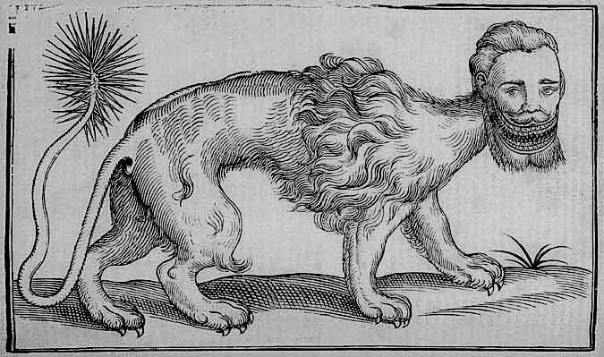 それによれば、マンティコアはインドに生息しているライオンに似た猛獣である。なお体は赤く、目は青色ないしは灰色である。しかし顔と耳は人間で、 上顎と下顎のそれぞれに3列の歯並びを備えていたという。