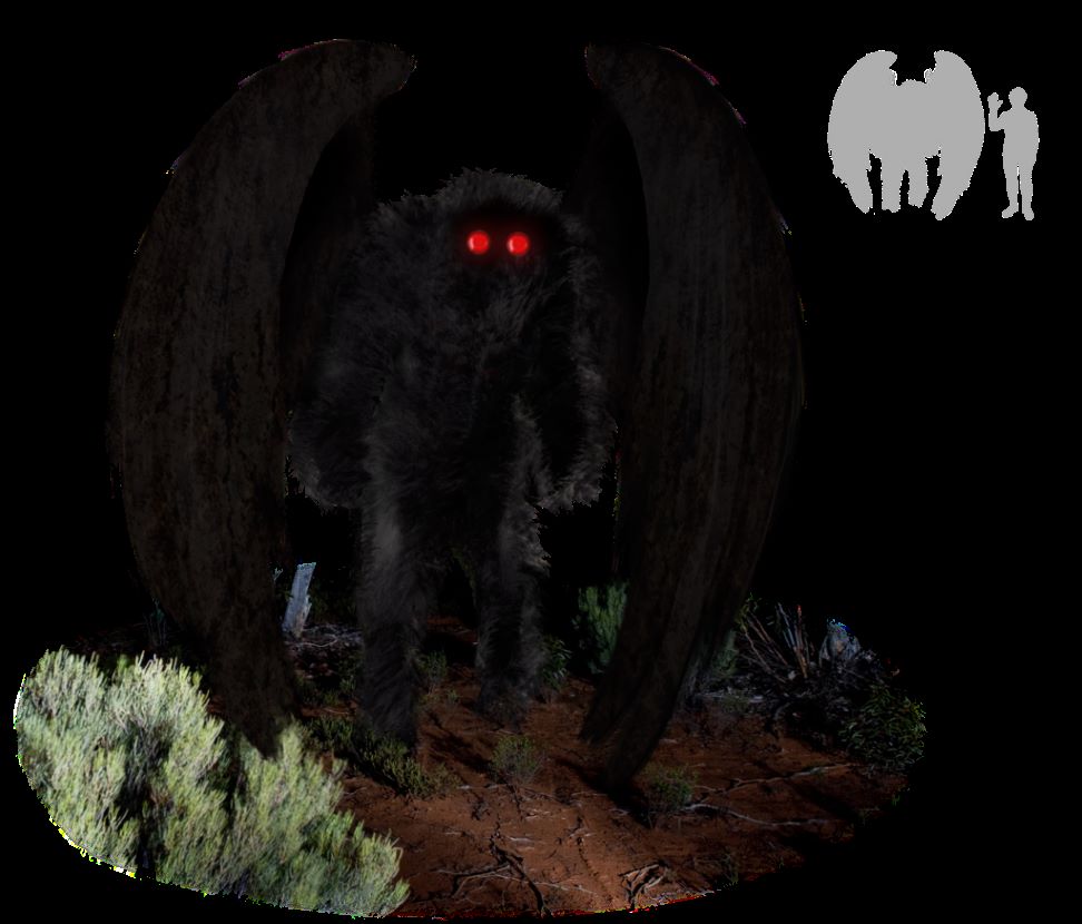 蛾人間「モスマン」と呼ばれたその存在は、体長2メートル、全身が褐色もしくは灰色の体毛で覆われ、頭部と胴体の境目がわからない姿でギラギラと光る赤い目を持ち、キーキーという鳴き声のようなものを聞いたという報告もある。また、広げた大きさがおよそ3メートルにもなる翼を持っており、しかも羽ばたかずに飛行するという。