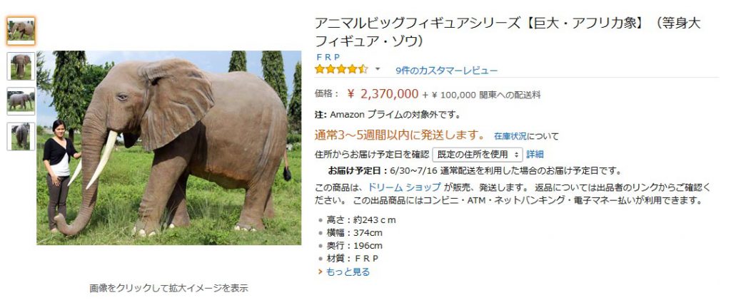 もちろん値段もビッグサイズでゾウは驚きの237万円。送料は10万円(Amazonプライス会員でも同額)である。