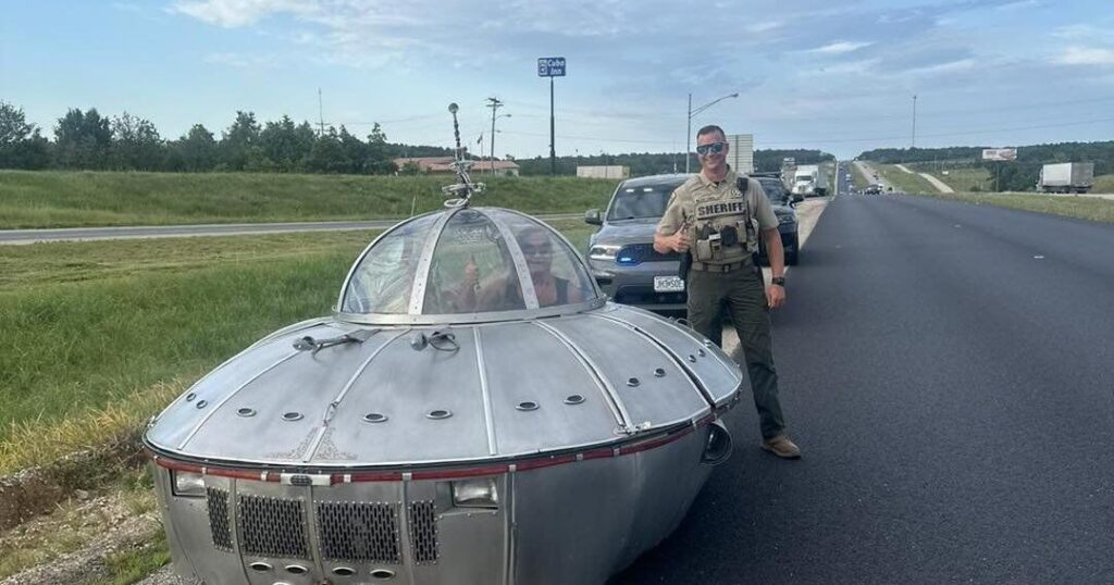 地元の保安官事務所がSNS上で語った所によると、 州間高速道路44号線にて金属製のUFOらしき奇妙な車両を発見。アダム・カーナル保安官は、この「UFO」が期限切れのナンバープレートを所持していたこと、さらに高速道路で車線内にとどまらなかったことが確認されたため、停車させ交通違反で検挙したと地元メディアは伝えている。
