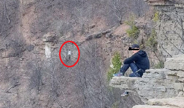 今回の写真もそこまで危ない撮り方はしていないものの、崖の縁に腰掛けている様子をカメラに収めたものである。しかし、その後ろをよく見て頂きたい。背後の岩壁に、うっすらと人間らしき姿が写っているのだ。