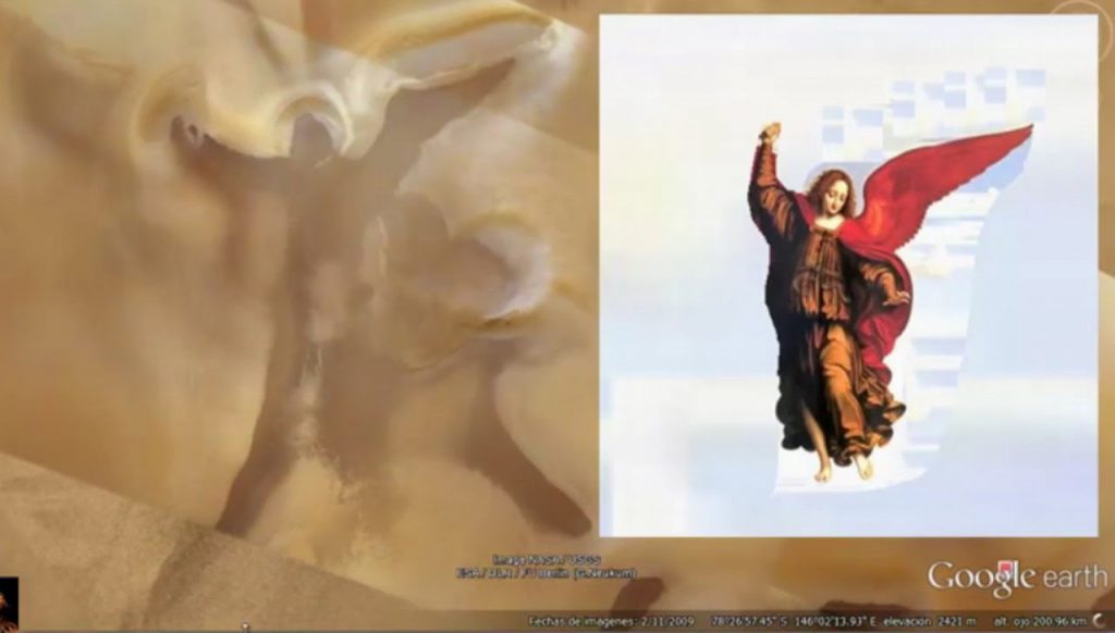 座標は77°30’2.74 “S 154°15’11.84” E。こちらを入力すると、火星の地表に大きな翼を広げた天使らしき姿が確認できる場所が出てくるのだ。頭の周囲には光の輪を思わせるクレーターも存在している。
