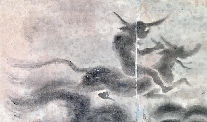 江戸時代に描かれたとされる『百鬼ノ図』(国際日本文化研究センター蔵)は、初めこそ様々な妖怪の出てくる『百鬼夜行絵巻』と似た内容なのだが、後半になると黒く渦を巻く奇妙な怪雲が現れる。様々な化け物の姿をとる黒雲を恐れ、他の妖怪達が逃げていく様子も描かれている。そして最後に姿を現すのが、角のある動物にまたがった大将らしき妖怪。この妖怪の頭は、まるで大きな飾りの付いたカブトをかぶっているようにも見えるのだ。もしかしたら、黒い雲を率いていたのは黄泉ゲンスイなのかも知れない。