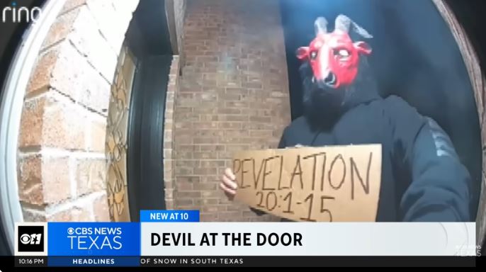 普通の家の玄関先にはそぐわない、2本の大きな角を生やした不気味な赤いヤギのような頭。全身には黒いローブをまとっており、さらに手には『ヨハネの黙示録20章1~15節』と書かれた看板を持った大柄な男がそこに立っていた。